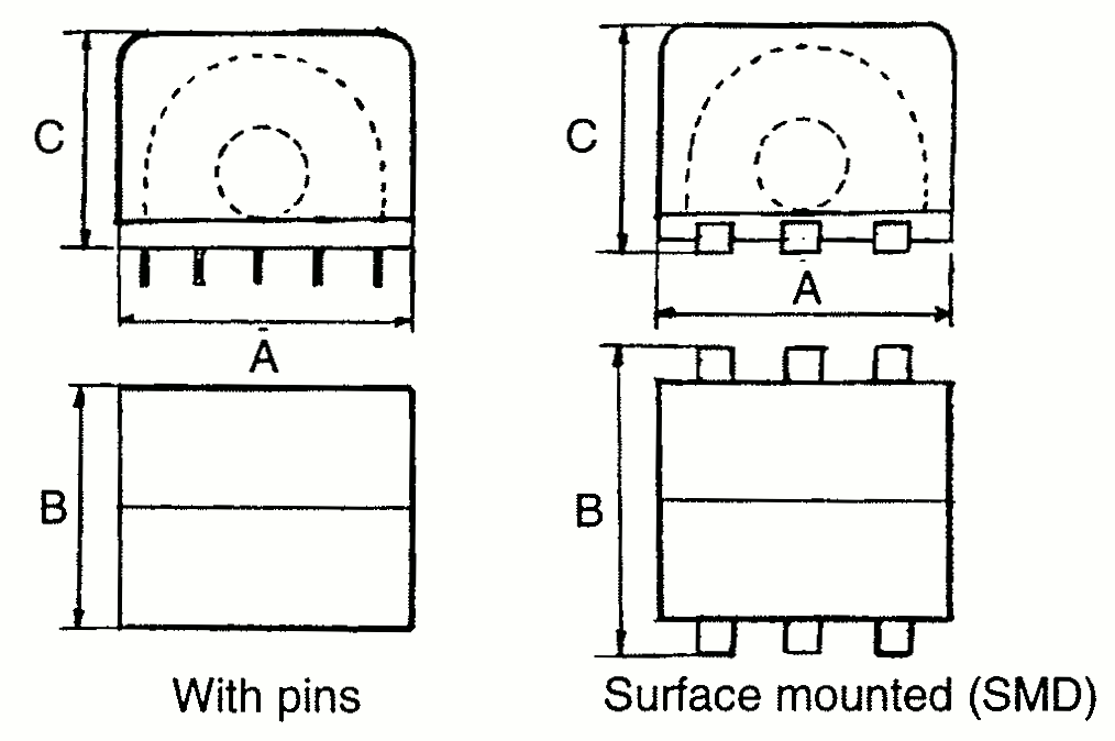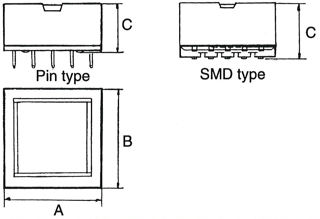 | Type | A | B | C | Type | Pin hole config.  | 			SMD Pad config.  |
